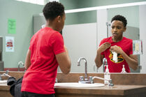 Kenny plays an online video game called Dungeon Lord as he gets ready for school. He is dancing while waiting for the bus, oblivious to when it pulls up. When he turns, he sees the students laughing at him for his dance moves. Anthony LaRusso then verbally bullies him on the bus. In gym class, Anthony guards Kenny but Kenny scores a layup against him, showing that he is skilled in basketball. Things worsen when Kenny accidentally checks a basketball into Anthony's face, albeit after Anthony had mocked him. Lia, a fellow classmate, diffuses the situation and is friendly towards Kenny. After school, Kenny talks to his dad on the phone, who is in deployment at a military base in Qatar. He admits it's difficult moving in the middle of the school year and making new friends. His father encourages him to give it time, be patient with his hard-working mother, and reminds him that while unfair, Kenny has to be the man of the house now.
